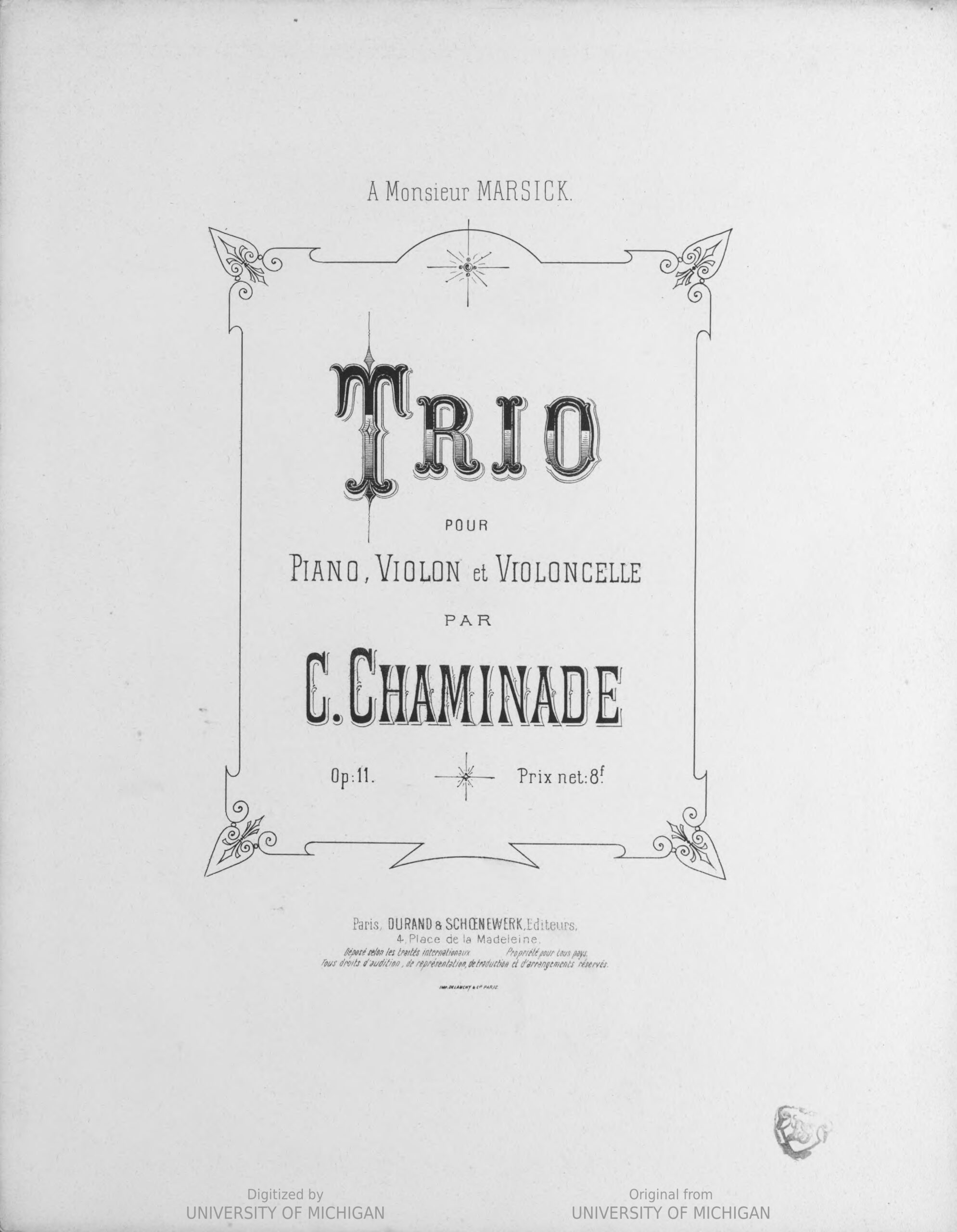 This piece was premiered on February 8, 1880, at the Salle Érard’s Sunday matinée. Chaminade was 22 years old and played the piano part, alongside Martin Marsick, violinist and Anton Hekking, cellist. The work was favorably received: according to Auguste Morel in Le Ménestrel, it was written “with an already firm and confident hand, revealing profound and abundant knowledge”. But Denis Magnus, critic for Gil Blas, commenting on the third movement, which particularly caught his attention, wrote: “The Scherzo especially is notable for its original shape; it is deliberately personal, quite square-cut, and moreover exudes a freshness of ideas typical of a young lady.” As for Morel, he noted that “it almost sounded like a fantasia for piano rather than a chamber music piece”.