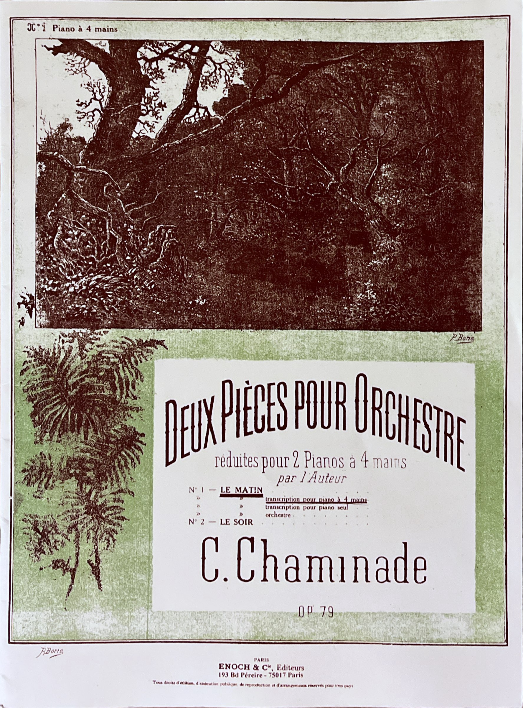 Op. 79, titled Deux Pièces pour Orchestre (Two Pieces for Orchestra), consists of two contrasting movements: Le matin (Morning) and Le soir (Evening). Although conceived for orchestra, the two pieces were never published in their original orchestral form. The work reflects Chaminade’s gift for lyrical melody and refined instrumental color, and the two movements function as character pieces, with Le matin conveying freshness and brightness of a new day, while Le soir evokes a more reflective, atmospheric mood of twilight. Chaminade frequently transcribed her works and published them in multiple alternative formats, a practice that contributed significantly to their wide dissemination. Two contrasting piano miniatures that capture the moods of day and night.