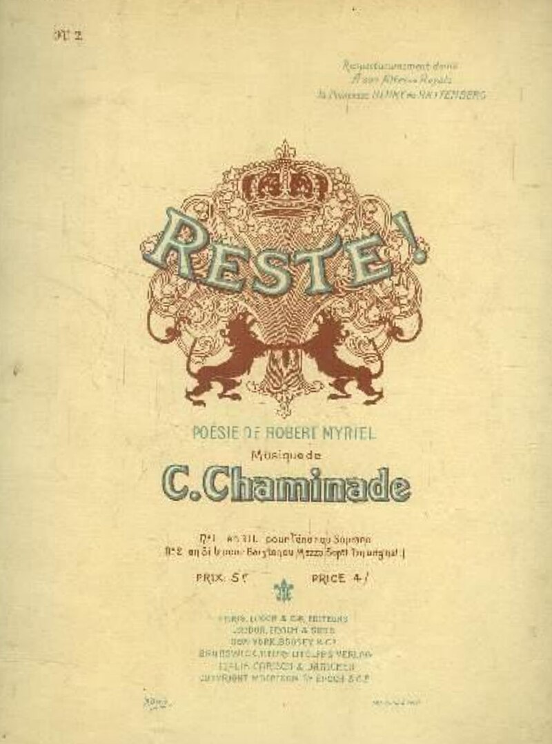 Text by Robert Myriel. In the late 1890s, Chaminade was invited to Windsor Castle by Queen Victoria, a devoted admirer of her music. She composed this mélodie and dedicated it to the Queen’s daughter, Beatrice. “Stay” describes the poet pleading for a beloved to remain near.